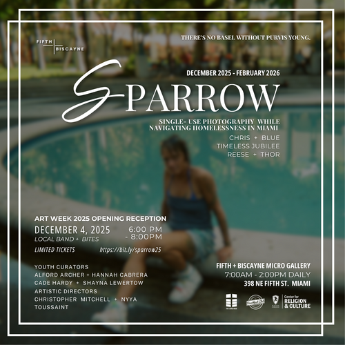 Curated by high school students Alford Archer, Hannah Cabrera, Cade Hardy, and Shayna Lewertow, SPARROW was developed at First Church Miami, where the Micro Gallery operates inside the church’s coffee shop. The exhibition presents photographs taken on disposable cameras by unhoused members of The Breakfast Club, a ministry of First Church Miami that has served the Downtown community for over 40 years. This exhibition is made possible by funding by The Center of Religion and Culture at Flagler College.
